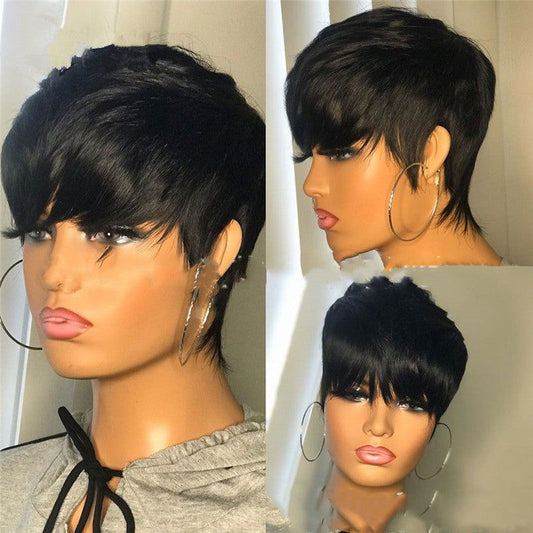 Chemical Fiber Hair, Black Oblique Bangs, Short Hair, Fluffy Short Straight Hair, Short Wig Headgear