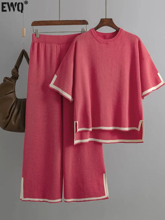 Minimalist Style Patchwork O-neck Short Sleeve Loose Sweater Casual Tops High Waist Pant 2 Piece Set