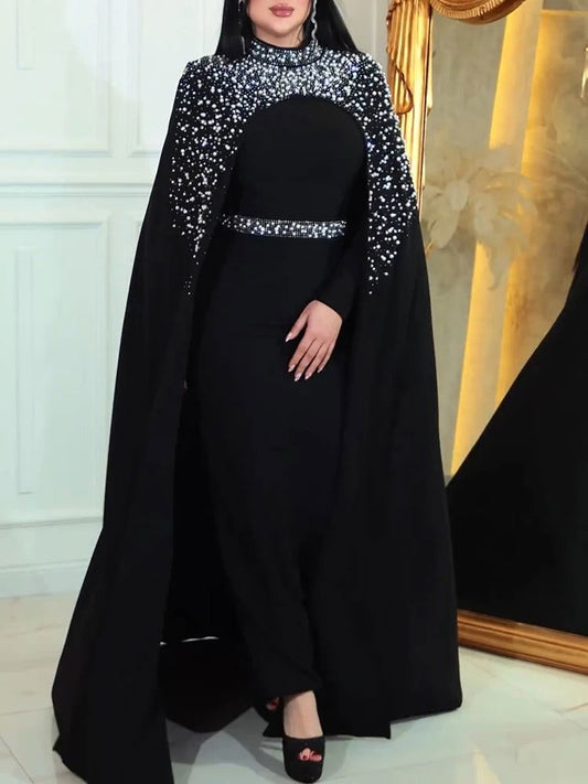 Banquet Evening Dress Two-Piece Set Outfits Y2K Cloak Sequin Chiffon Dress Women Batwing Sleeve Muslim Abaya Caftan Robe