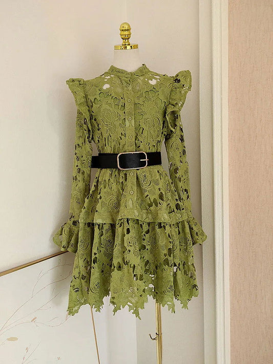 IEQJ Solid Lace Embroidered Hollowed Out Wooden Ear Edge Dresses For Women Long Sleeve Stand Collar Dress Female Clothes 3WQ9645