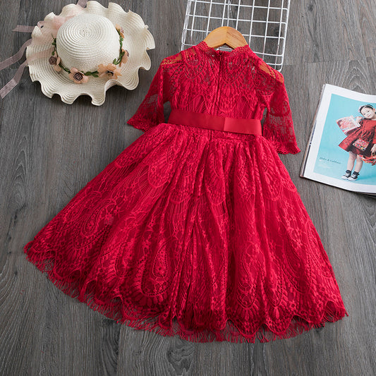 Red Kids Dresses For Girls Flower Lace Tulle Dress Wedding Little Girl Ceremony Party Birthday Dress Children Autumn Clothing