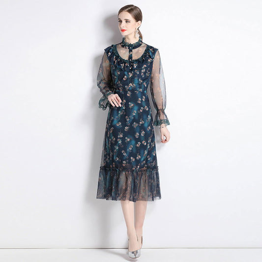 Fashion V-neck Dress Women's Elastic Waist Pleated Ruffled French Skirt Long Sleeve Short Dress