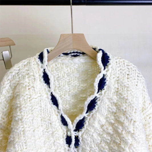 Hand Knit Color Block Knit Cardigan Side Pockets Loose Vintage Sweater Jacket Top Autumn Winter Woman Clothing