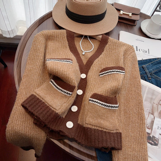 Lazy V-neck loose knit cardigan jacquard jacket, caring and fashionable sweater for women