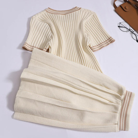 Vintage Slim Knit 2 Pcs Skirt Sets Women 2024 Summer Gold Buttons Short Sleeve Sweater + Pencil Long Skirt Outfits Matching Set