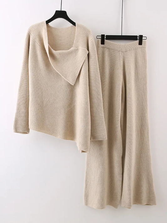 Women's Knitted Two Piece Sets Irregular Long Sleeve Loose Tops Solid Color Casual Trousers Female Suits Autumn