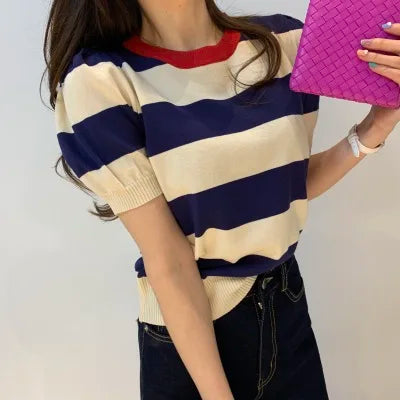 Summer Korean Knitted Striped T Shirts Tops Women Short Sleeve O-neck Casual Fashion Female Tees Pullovers T-shirts