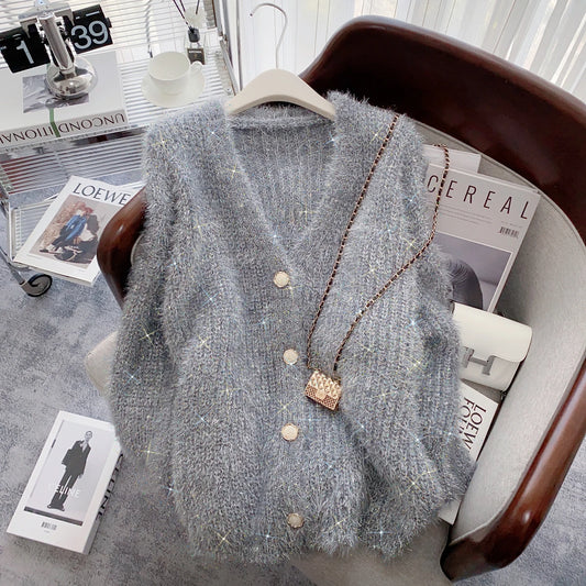 Silver Thread Knitted Sweater Coat Women V-neck Loose Fashion Chic Cardigan Jacket Long Sleeve Oversized Thicken Jumpers Tops