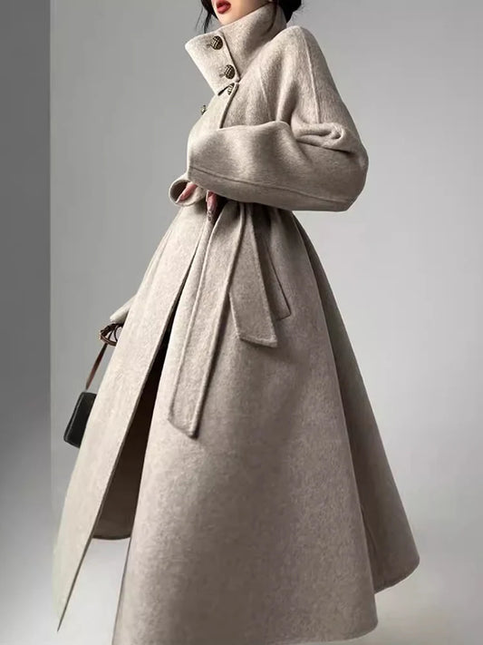 Stand collar double-sided wool coat women's long lace up cashmere coat