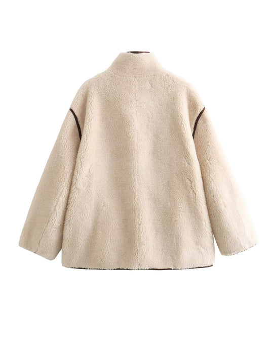 Color blocked fleece loose short jacket flight jacket for women