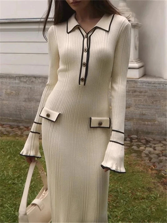 Early Fall Luxury Brief Gentle Beige Color Midi Knitting Dress Quality Buttons Strongly Elastic for Women