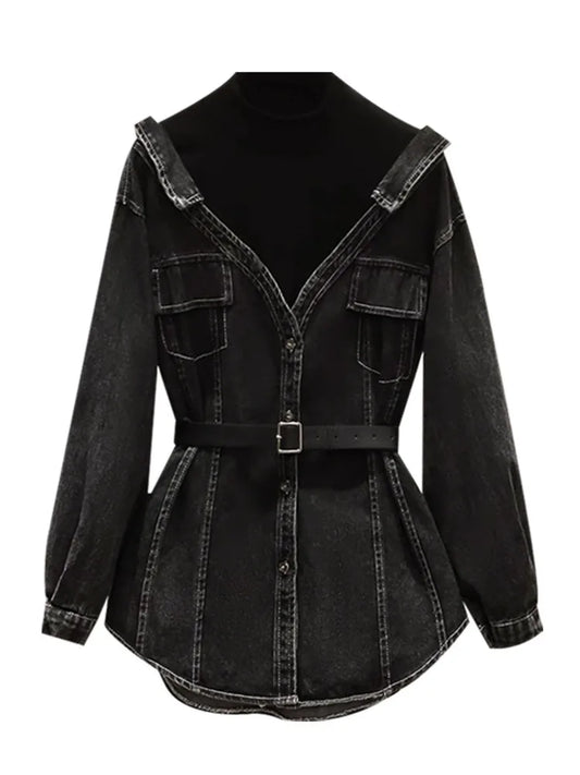 Fashion Women's Fake 2 Pcs Denim Coat Belt Lapel Patchwoek Contrast Color Pockets Slim Jackets Autumn