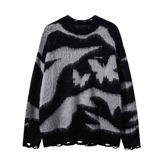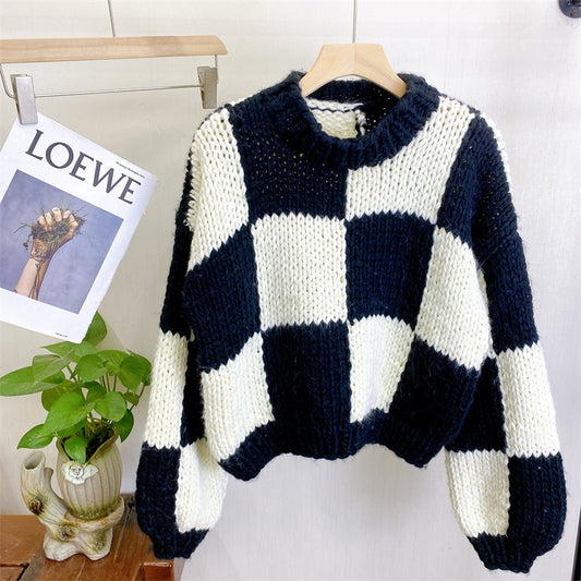 Fashionable contrasting plaid splicing thick needle sweater with stylish hand woven thick top for women