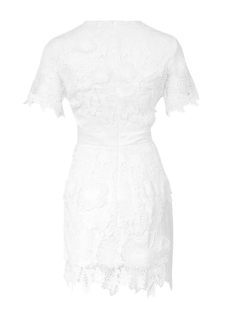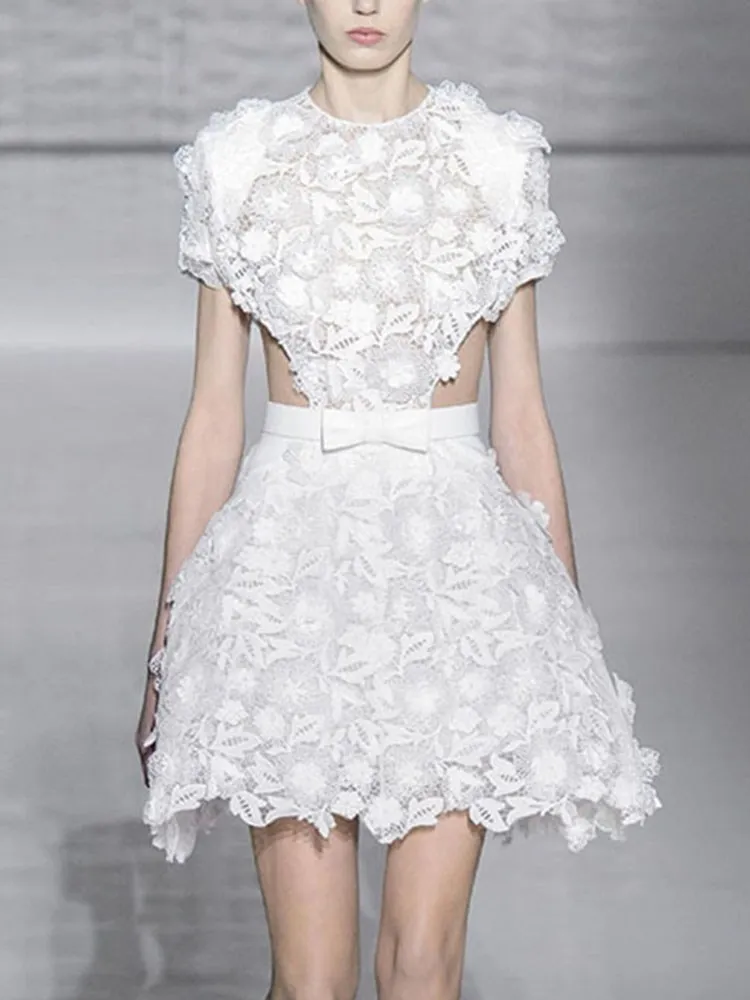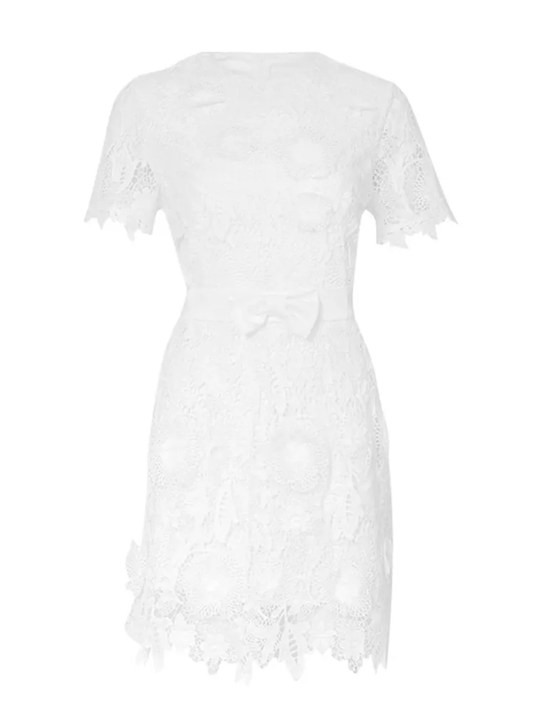 KBQ Embroidery Hollow Out Irregular Hem Dress For Women Round Neck Short Sleeve Spliced Bow Mini Solid Elegant Dress Female New