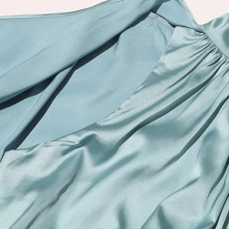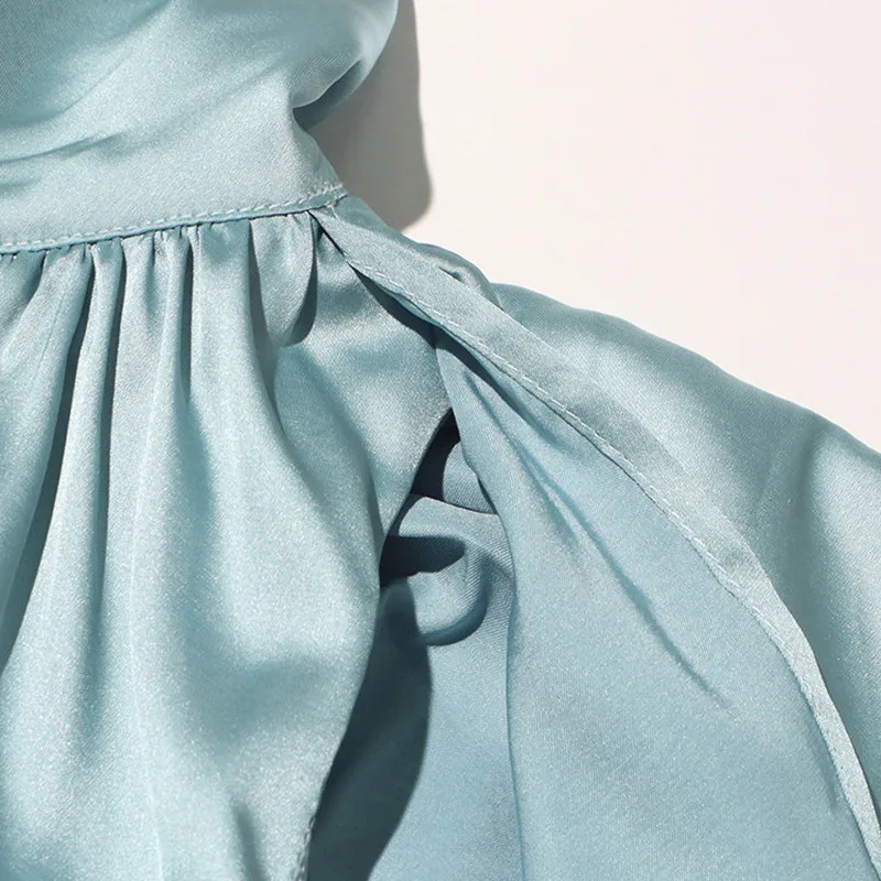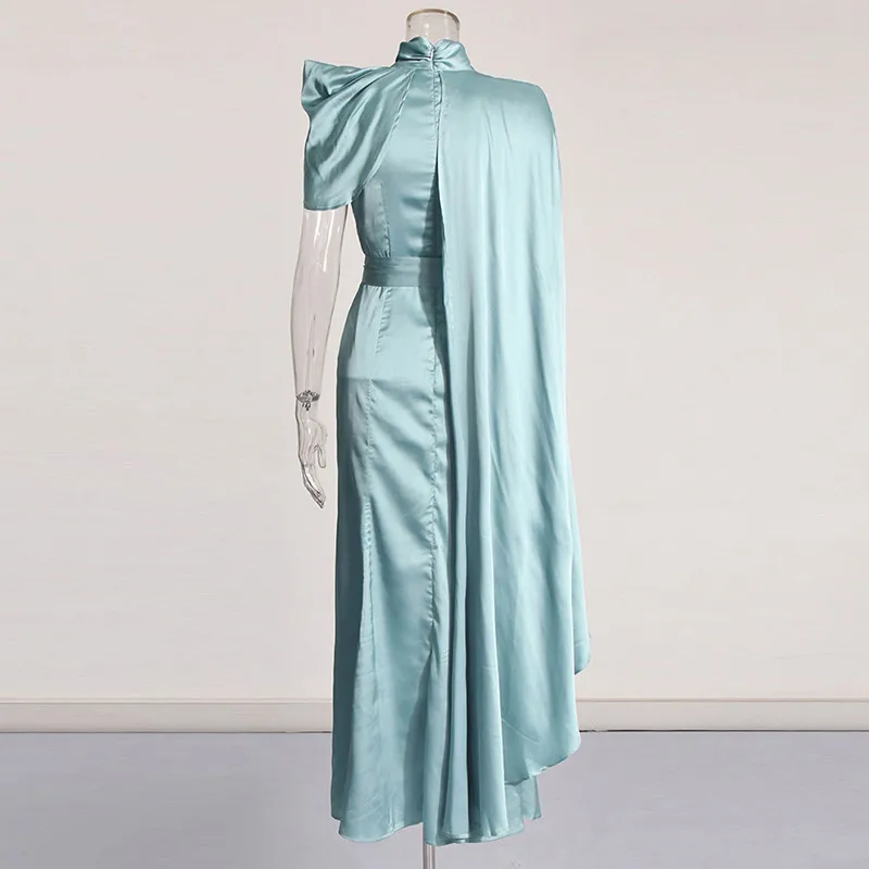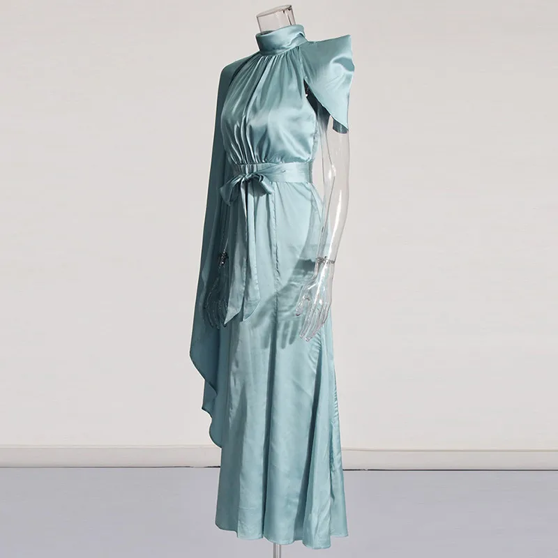 KBQ Solid Spliced Folds Elegant Dress For Women Stand Collar One Shoulder Sleeve High Waist Temperament Dresses Female Fashion