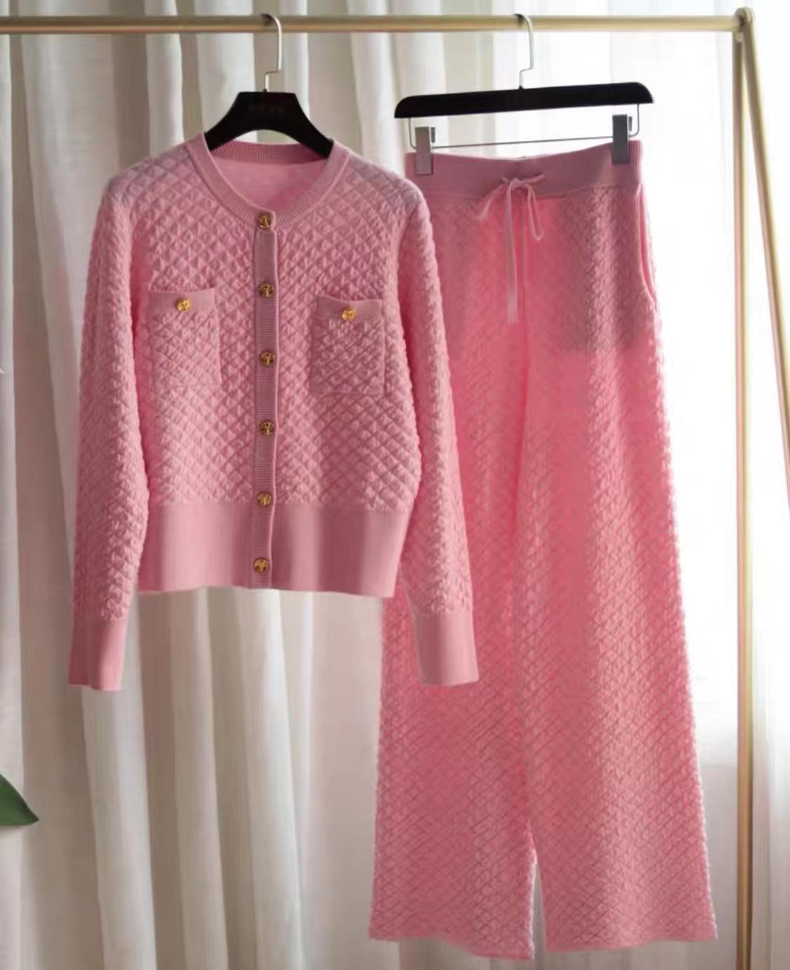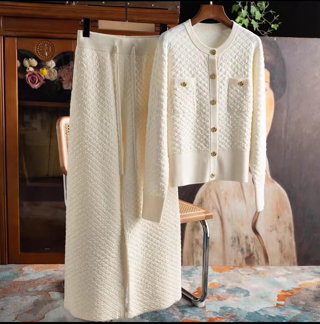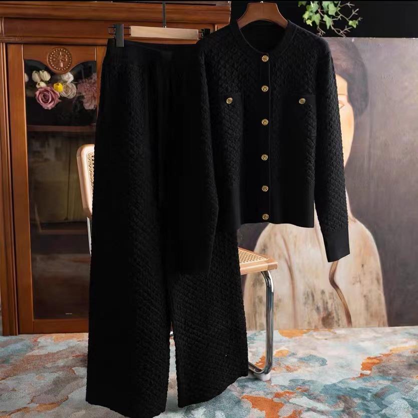 Xiaoxiangfeng Bubble Texture Gold Buckle Cardigan+Wide Leg Pants Set