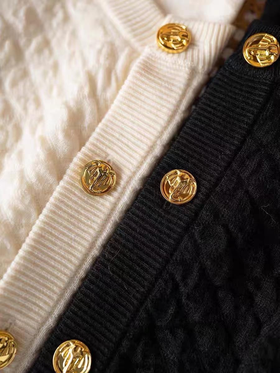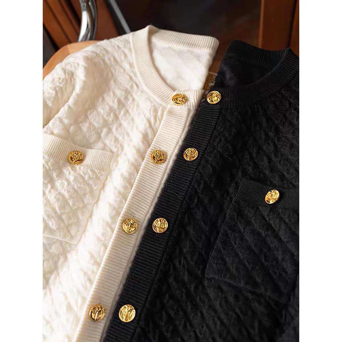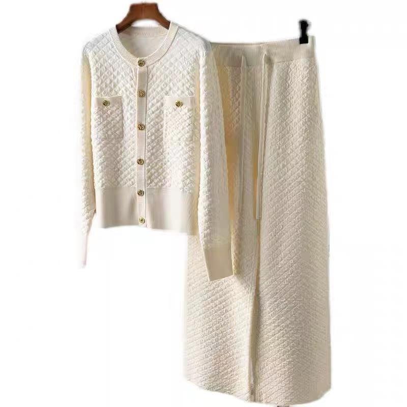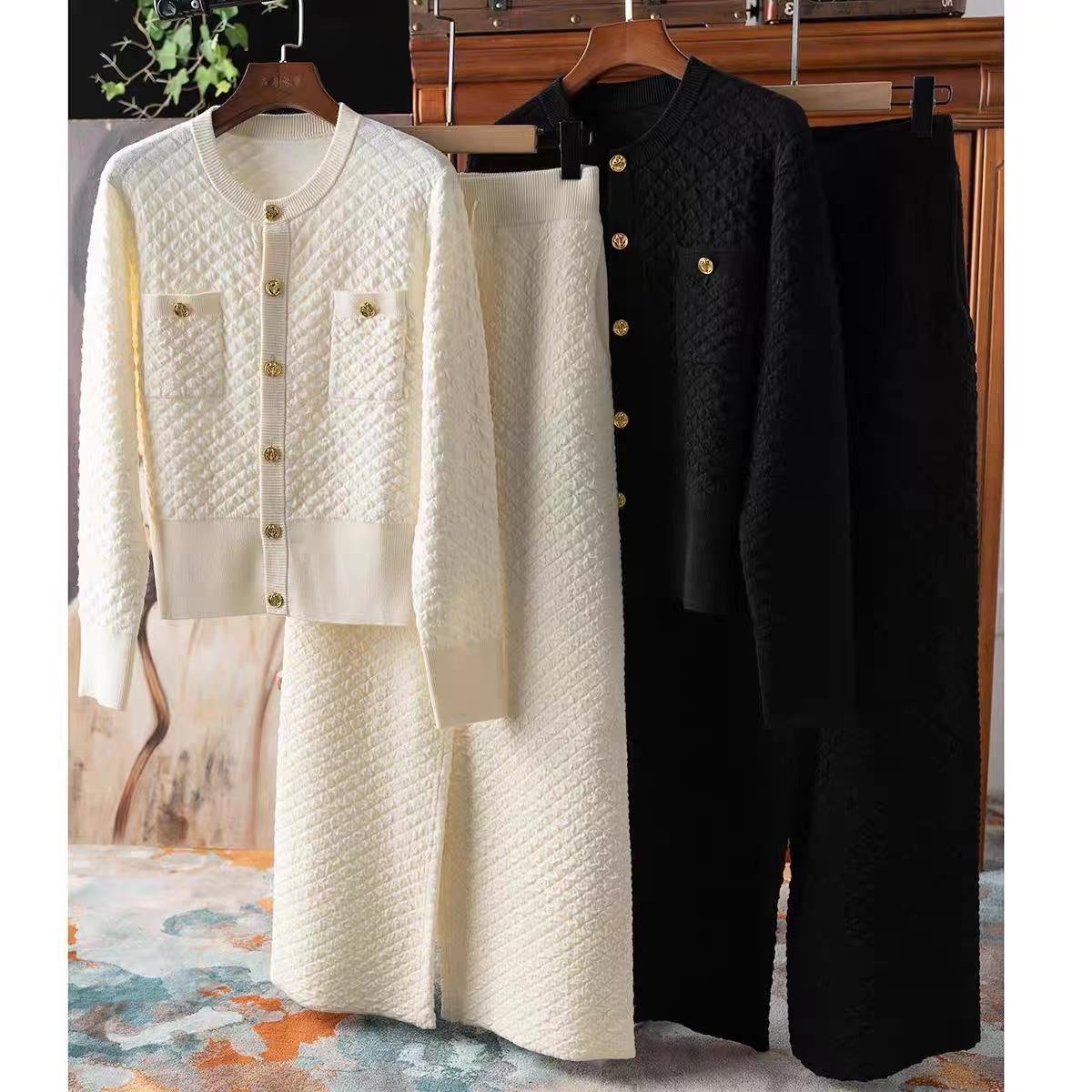 Xiaoxiangfeng Bubble Texture Gold Buckle Cardigan+Wide Leg Pants Set