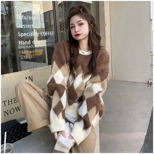 Vrouwen Khaki Kleding Vintage Breien Trui Chic Contrasterende Kleuren Lange Mouw Koreaanse Mode Baggy Vrouwelijke Winter Korte Tops