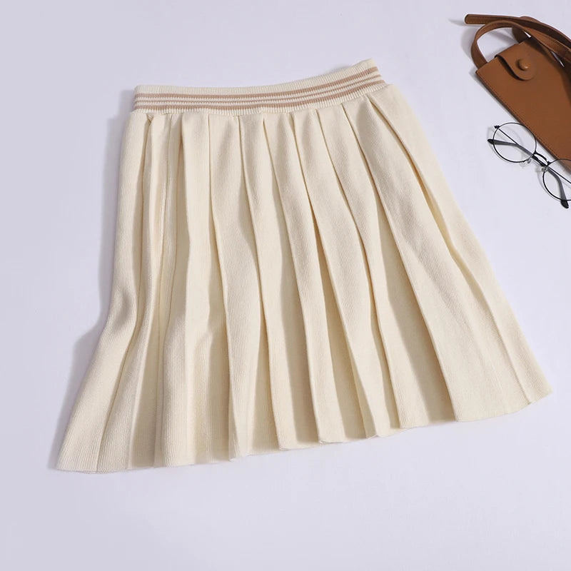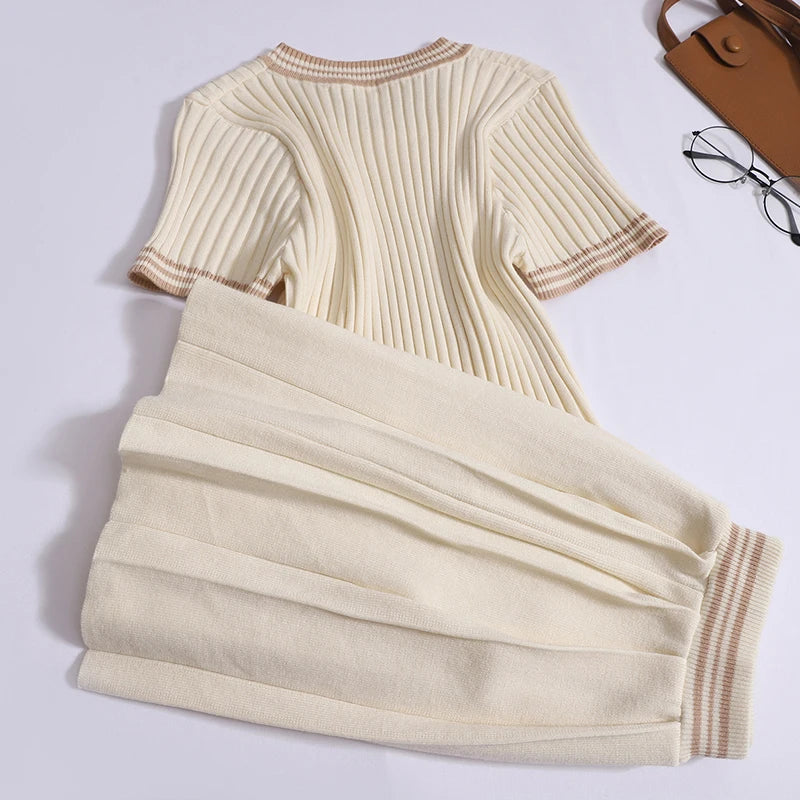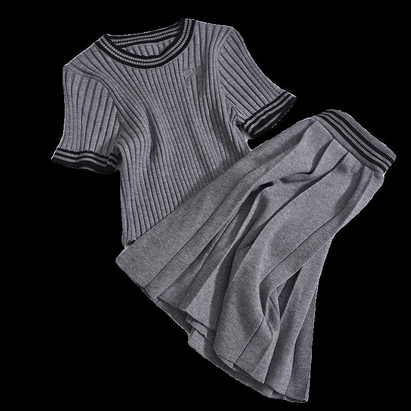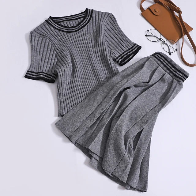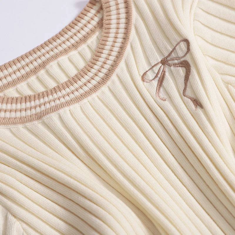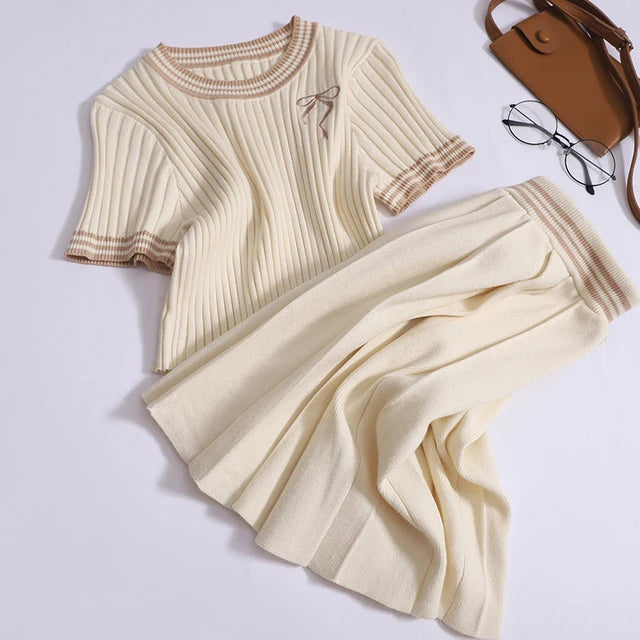 Kleurgeblokte set ronde hals geborduurde strik korte mouwen gebreide trui slim fit geplooide korte rok tweedelige set