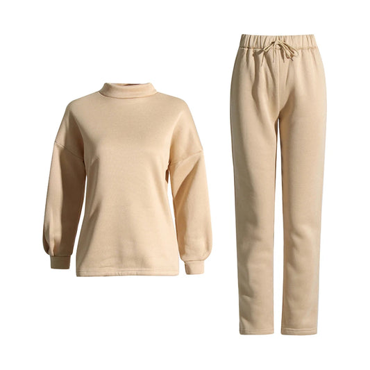 VGH Solid Two Piece Sets For Women Stand Collar Long Sleeve Tops High Waist Spliced Drawstring Pants Casual Set Female Style New