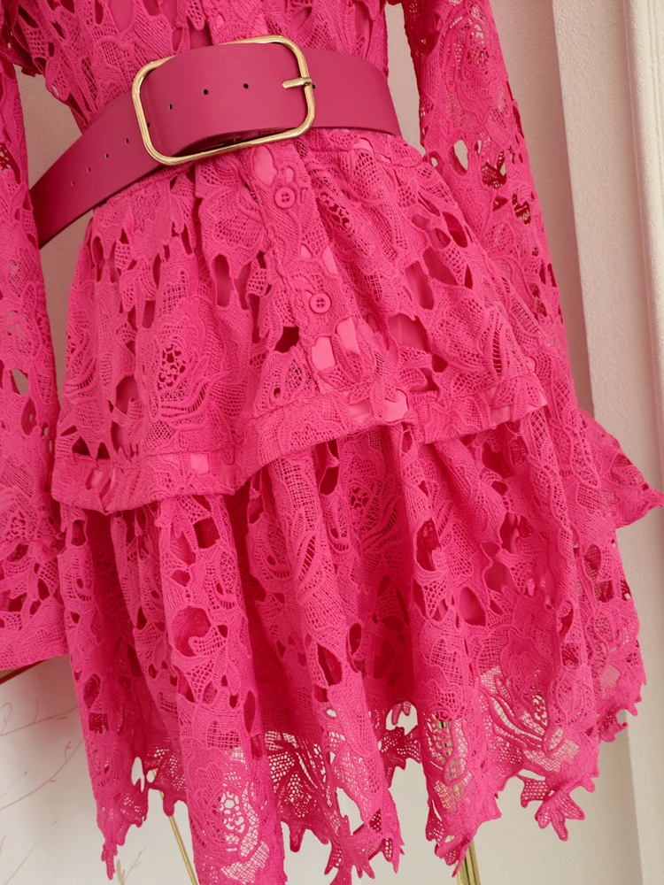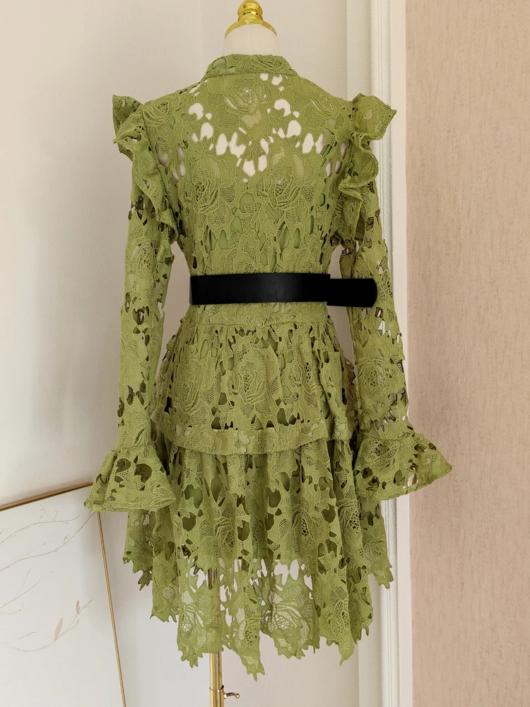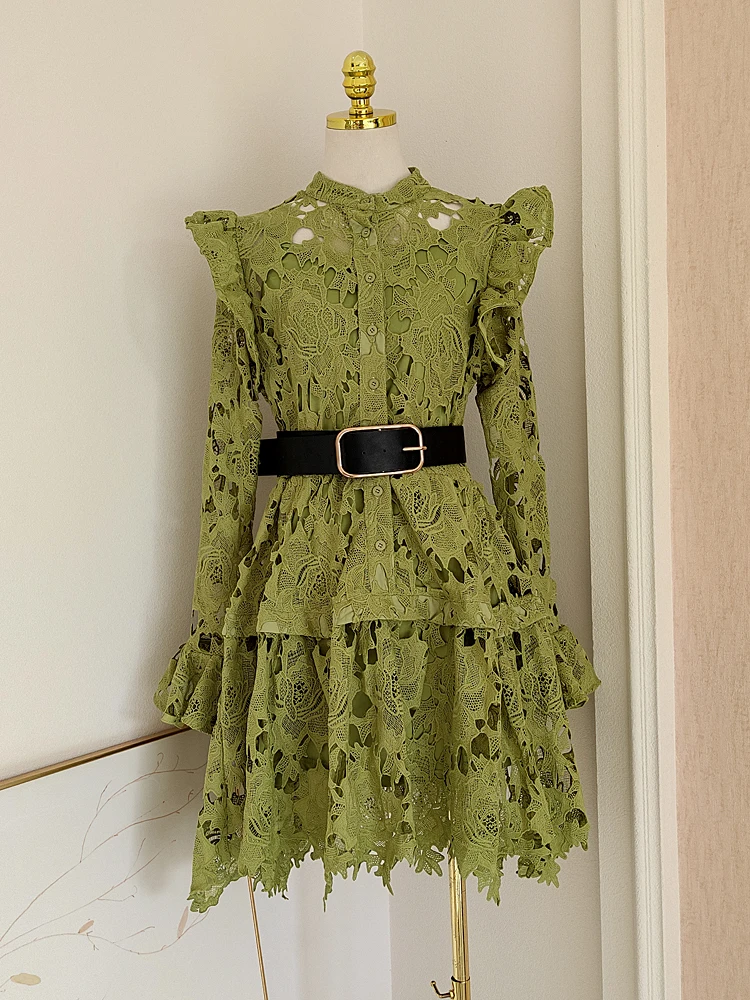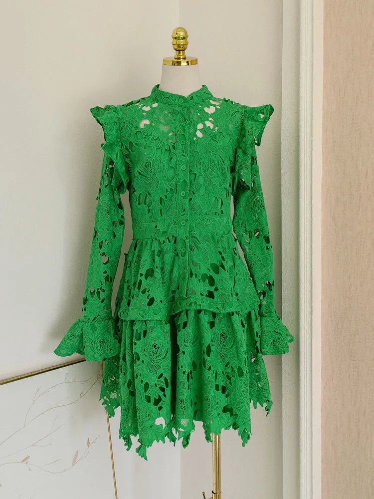 IEQJ Solid Lace Embroidered Hollowed Out Wooden Ear Edge Dresses For Women Long Sleeve Stand Collar Dress Female Clothes 3WQ9645