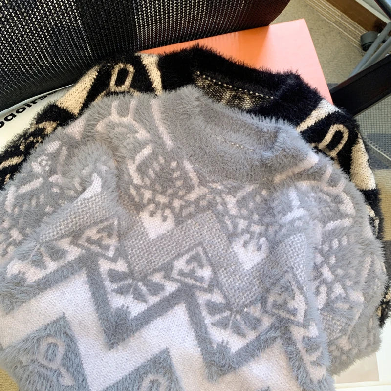 Vintage Jacquard Faux Mink Knit Sweater Pullover Women Loose Elegant Streetwear Fashion Tops Long Sleeve O-neck Jumpers