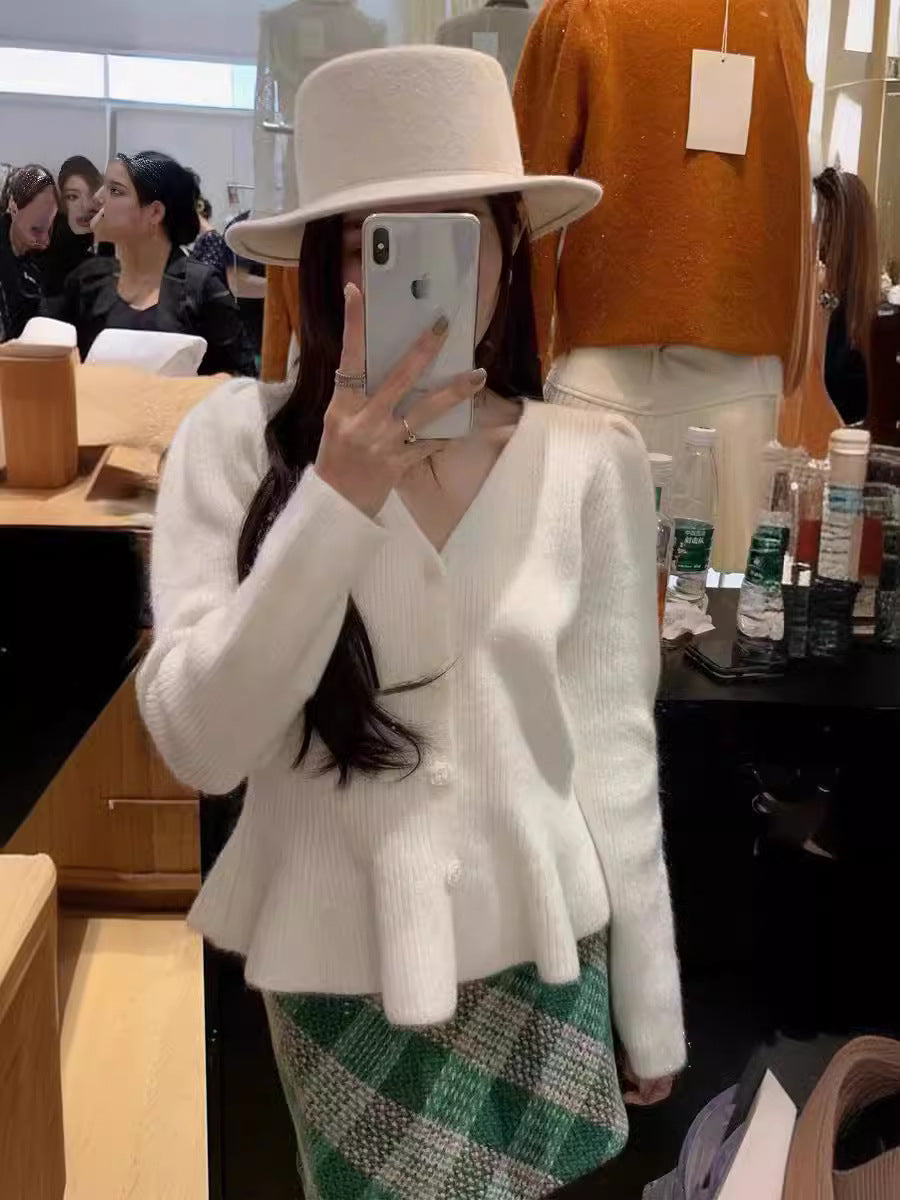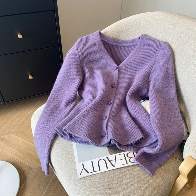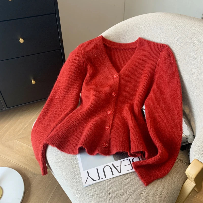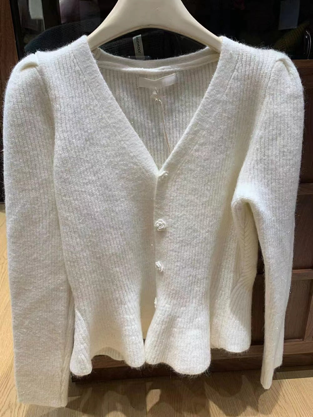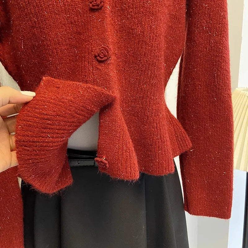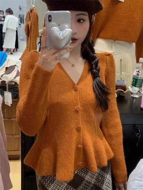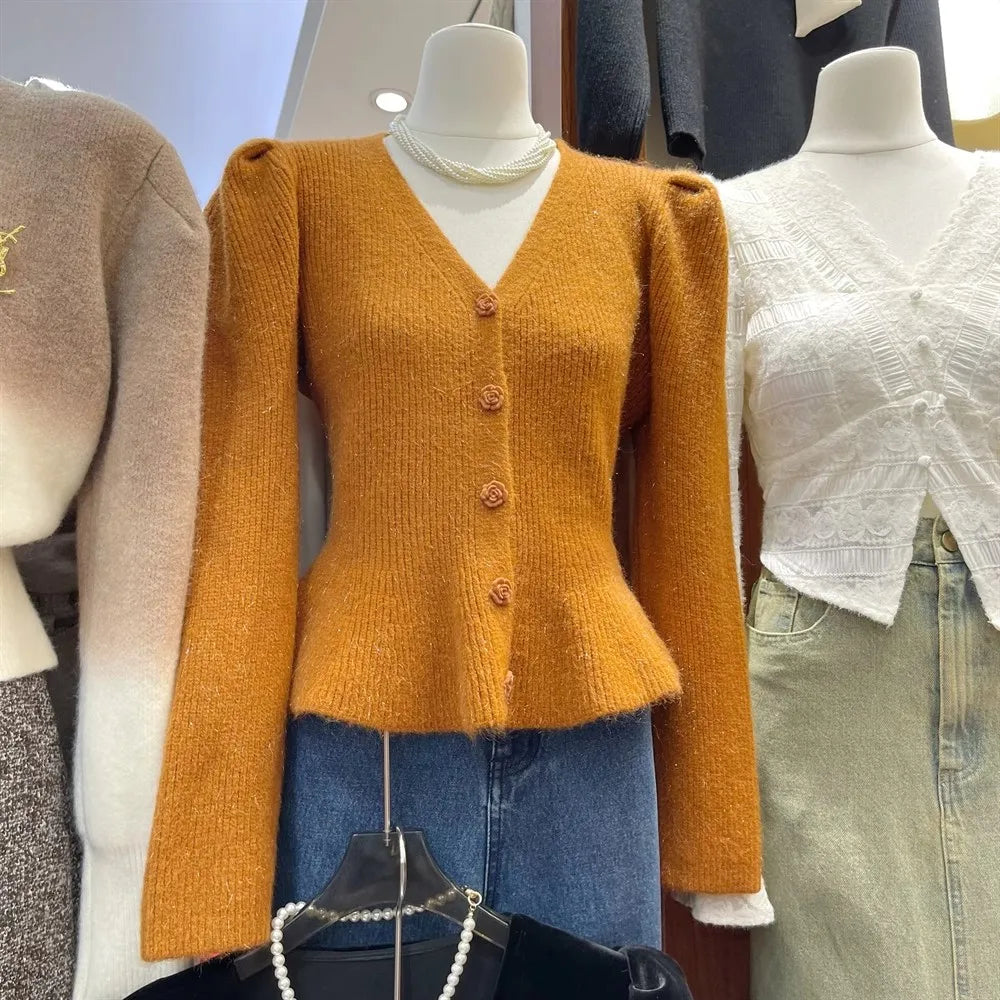 Autumn Winter Orange Bright Silk Knitted Sweater Cardigan Fashion Women Neck Rose Floral Buttons Ruffles Short Coat Tops