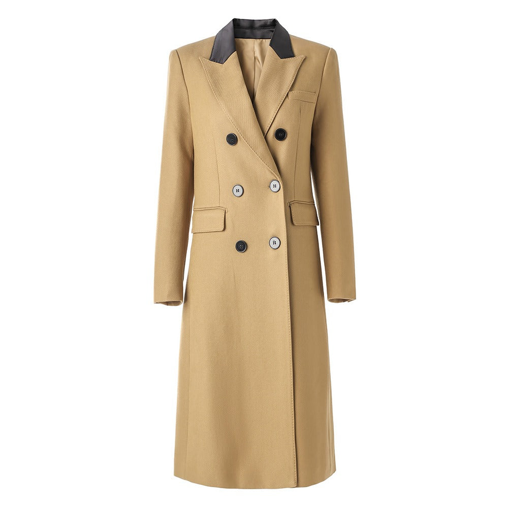 Classic double breasted wool twill fabric contrasting long coat with bead edge length