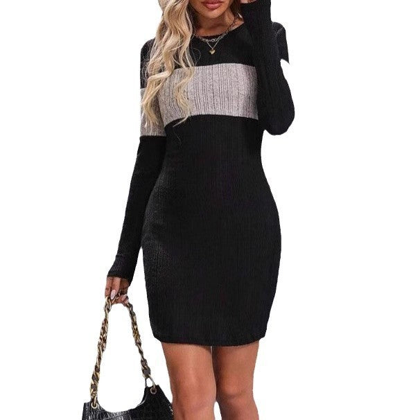 Color Contrast Patchwork Round-neck Long-sleeved Dress