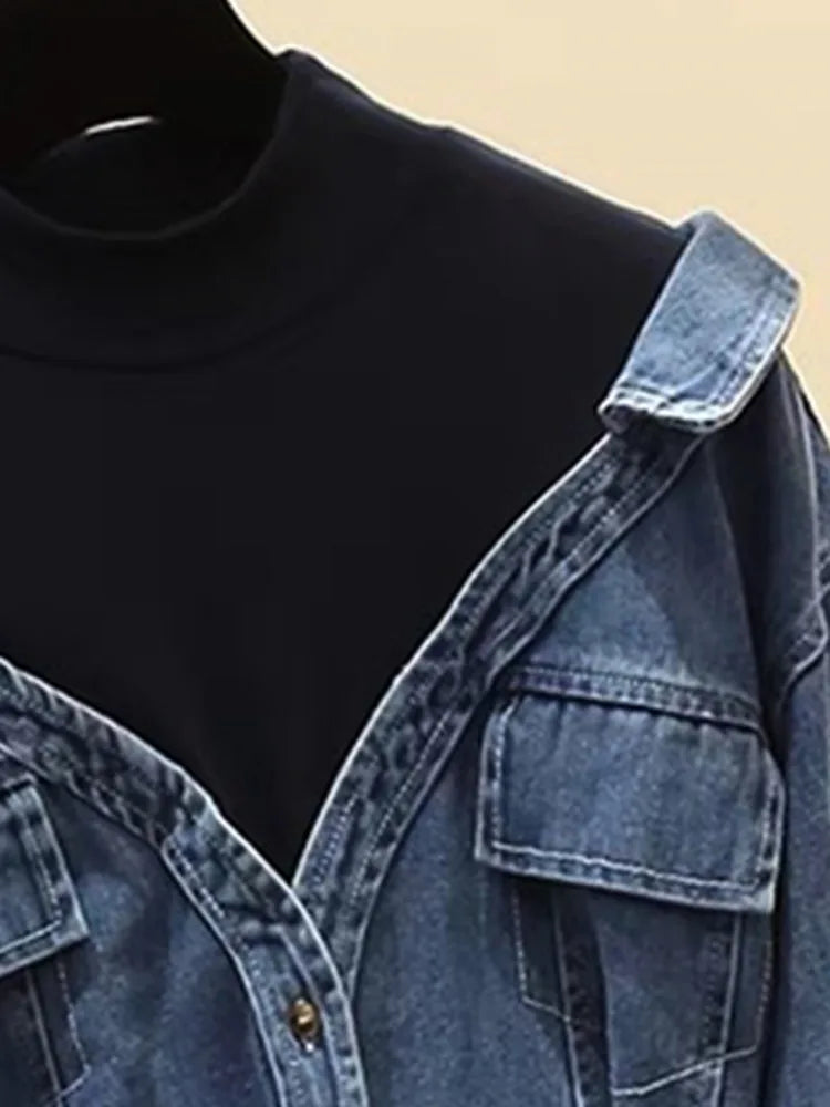 Fashion Women's Fake 2 Pcs Denim Coat Belt Lapel Patchwoek Contrast Color Pockets Slim Jackets Autumn