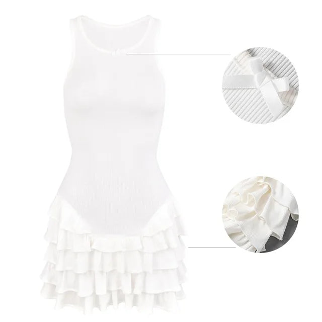 Frill Tank Dress For Women Sexy See-through Sleeveless Slim Solid Vest Mini Dress Ribbed Ruffled Bodycon Dresses Summer