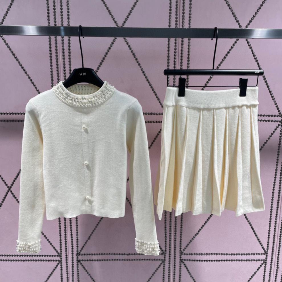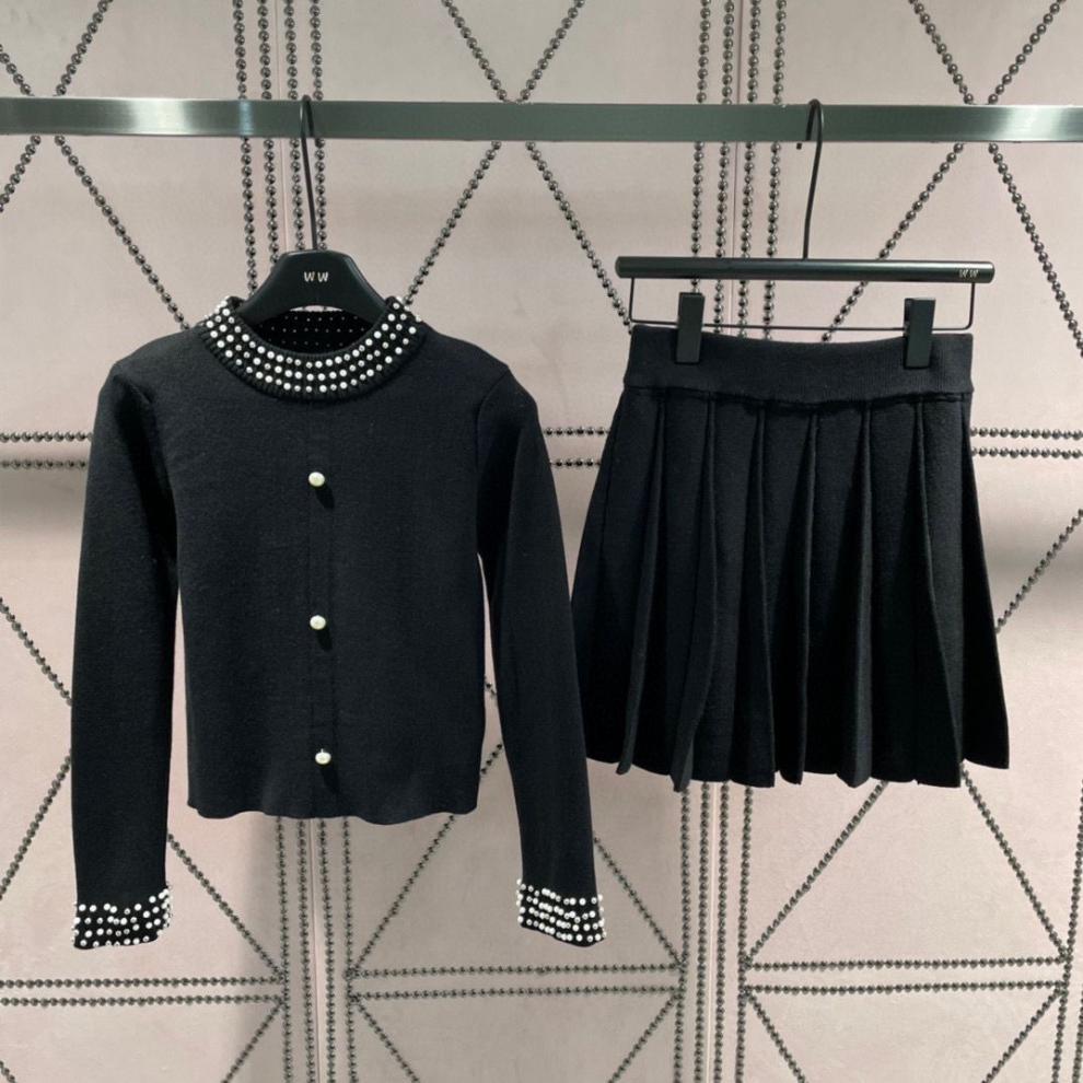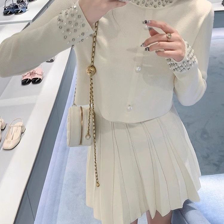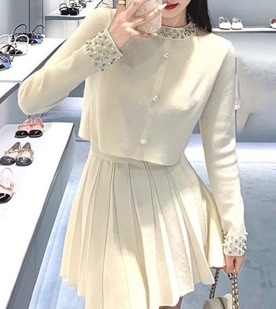 Heavy industry nail bead knitted suit cardigan high waisted pleated skirt two-piece set