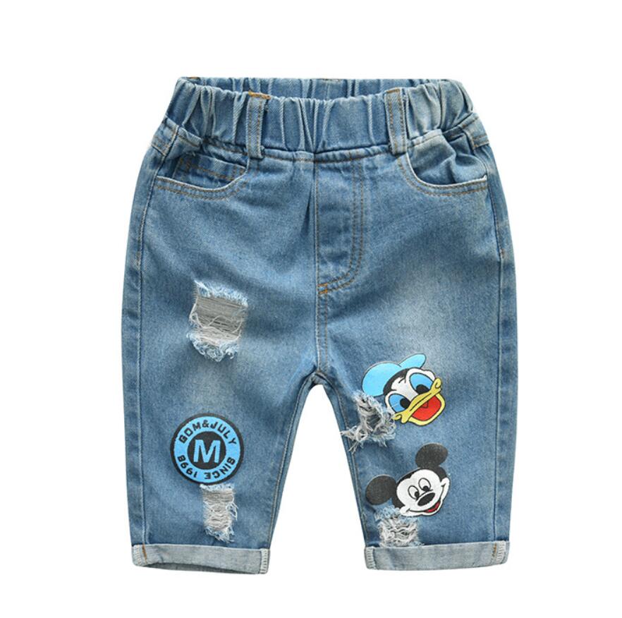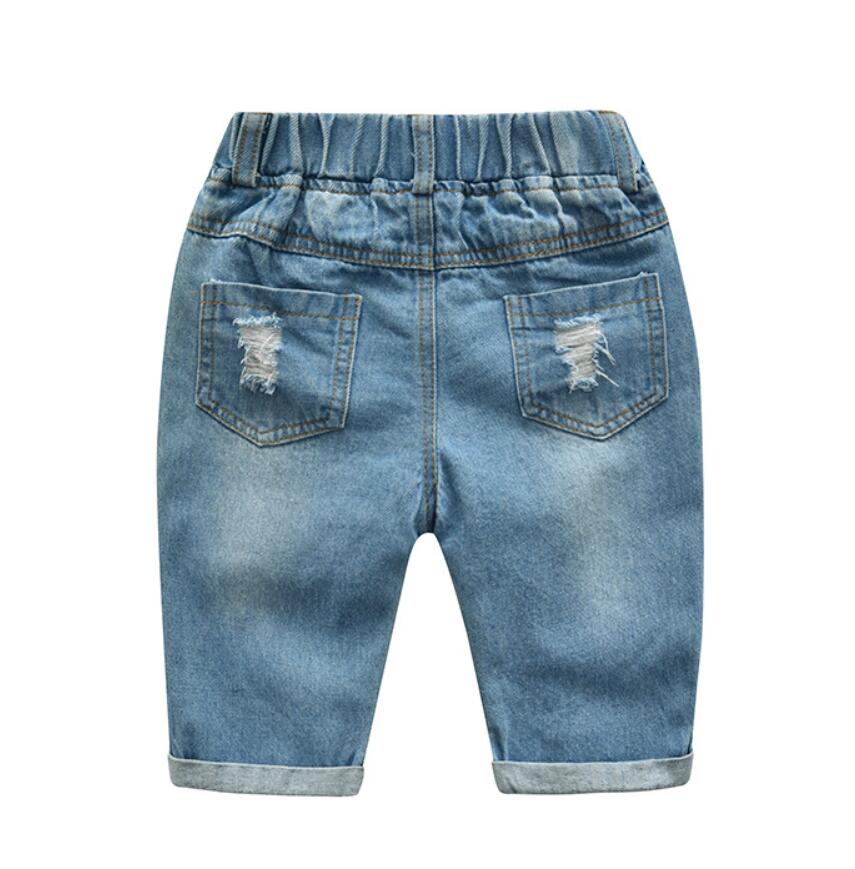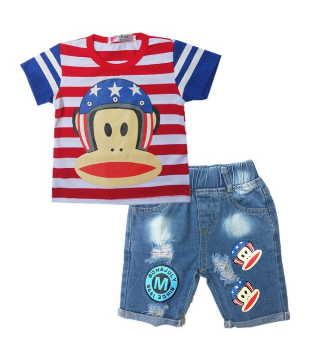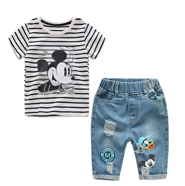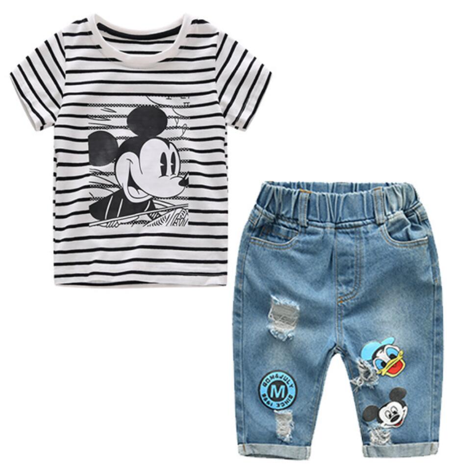 Infant Boys Girls Summer Cartoon Striped T Shirt + Denim Shorts Clothes 2pcs Sets Children Kids Hole Jeans Clothing