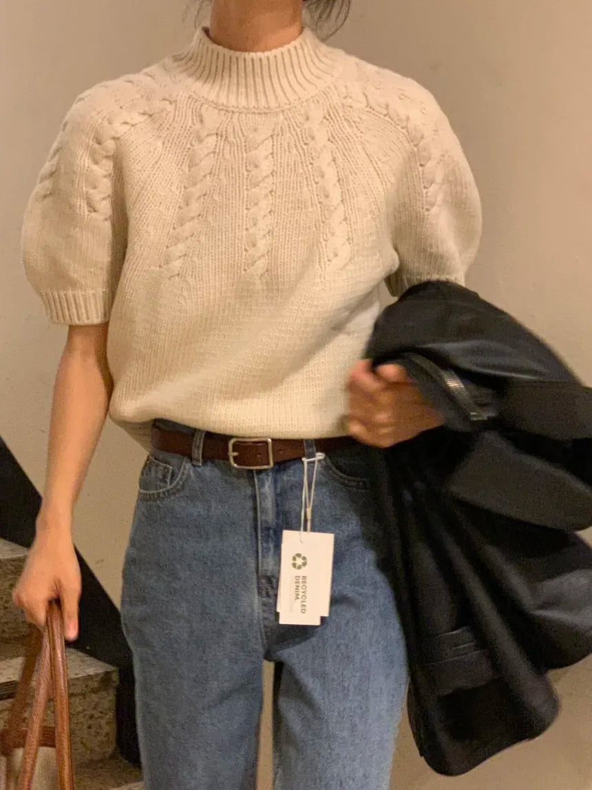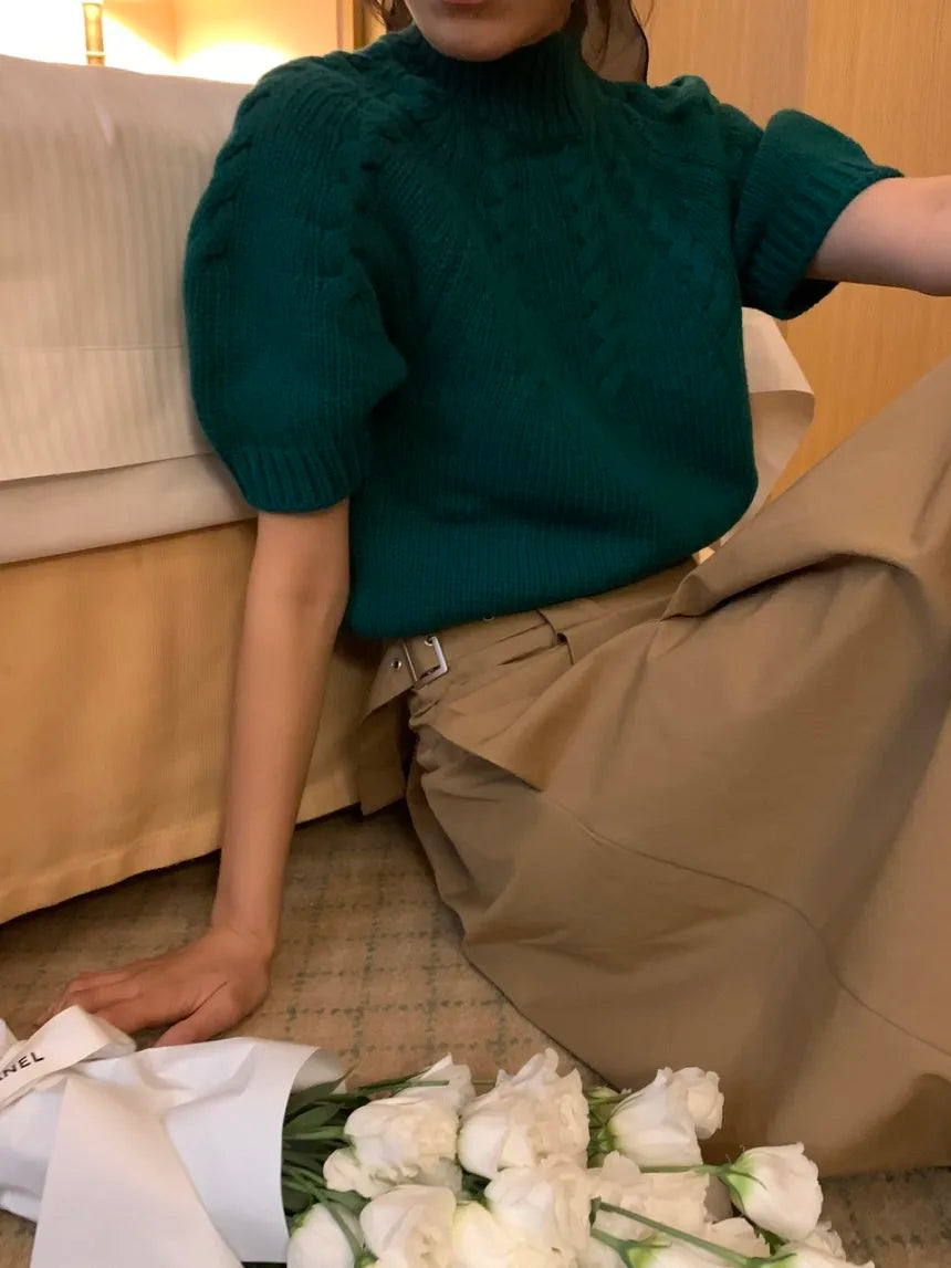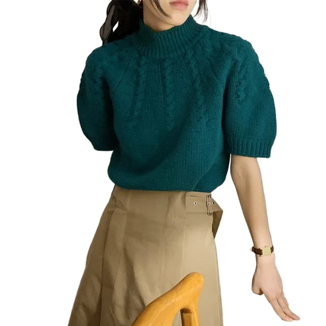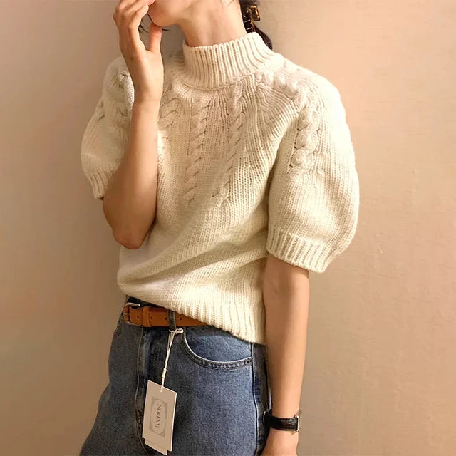 Korean Stand Collar Sweater Pullover Women Twisted Knit Elegant Vintage Tops Knitwear 2024 New Short Sleeve Chic Ladies Jumpers