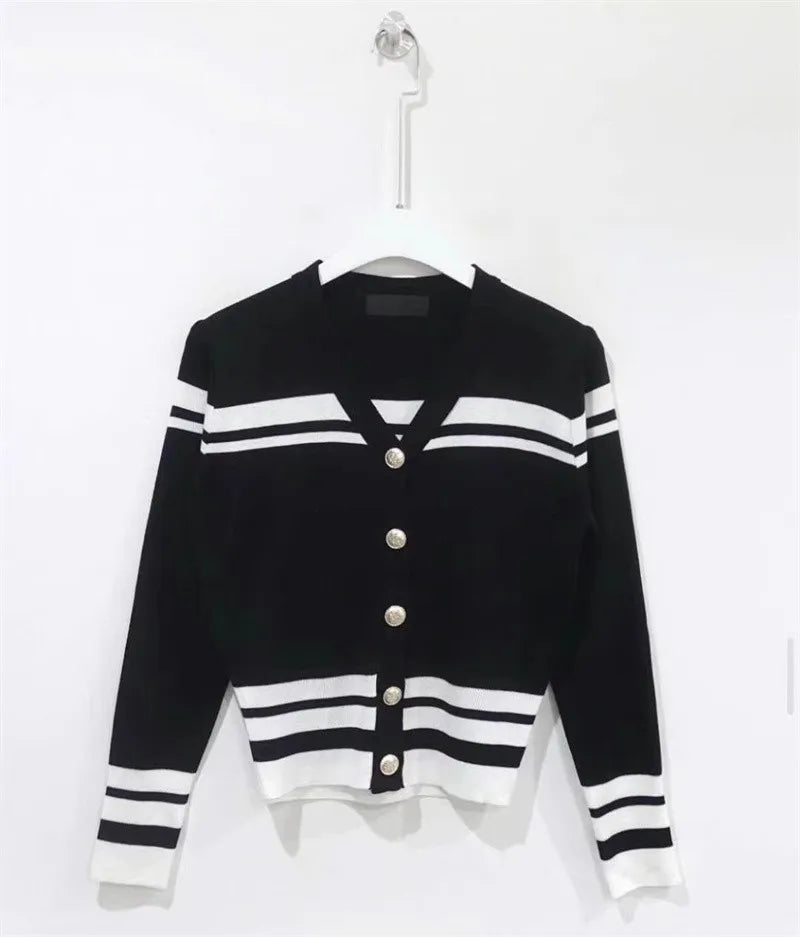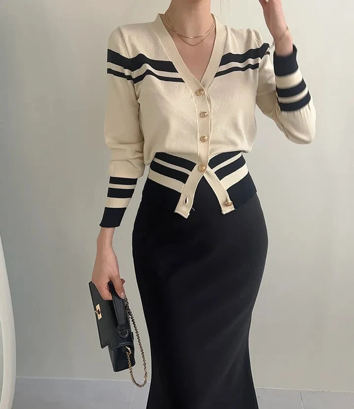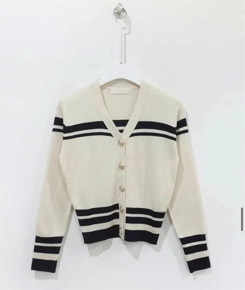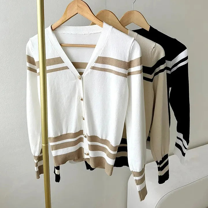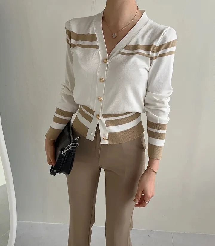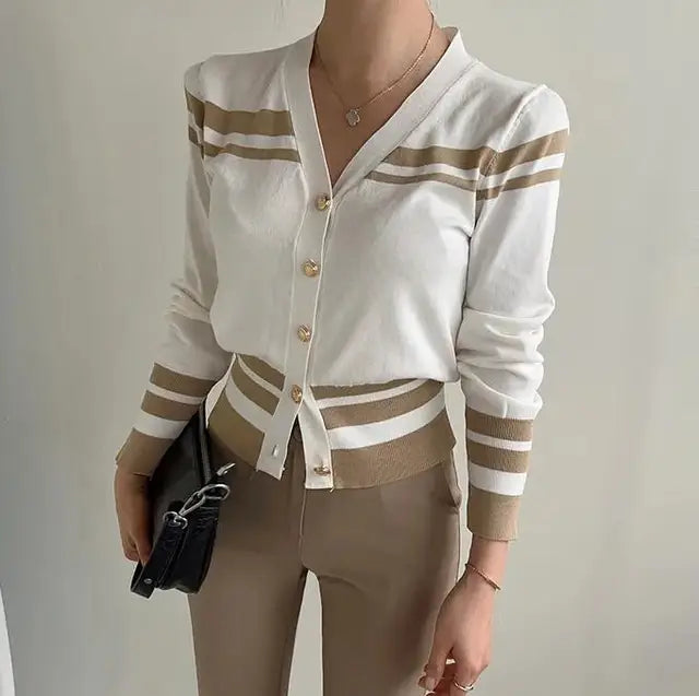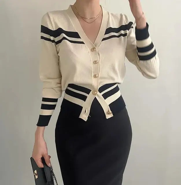 Korean Striped Knit Sweater Cardigan Women Long Sleeve V-neck Knitwear Tops Autumn Workwear Elegant Fashion Ladies Jumpers