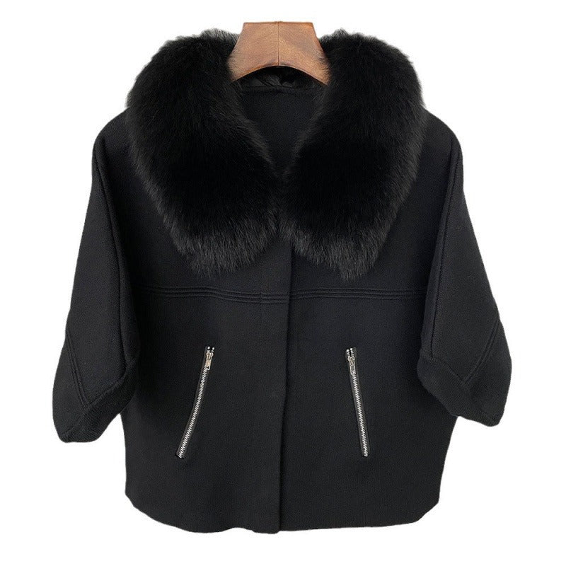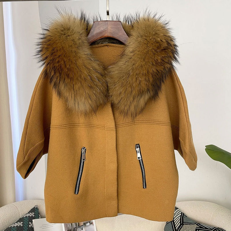 Short knit sweater with real fox fur collar fashionable bat sleeves cardigan jacket