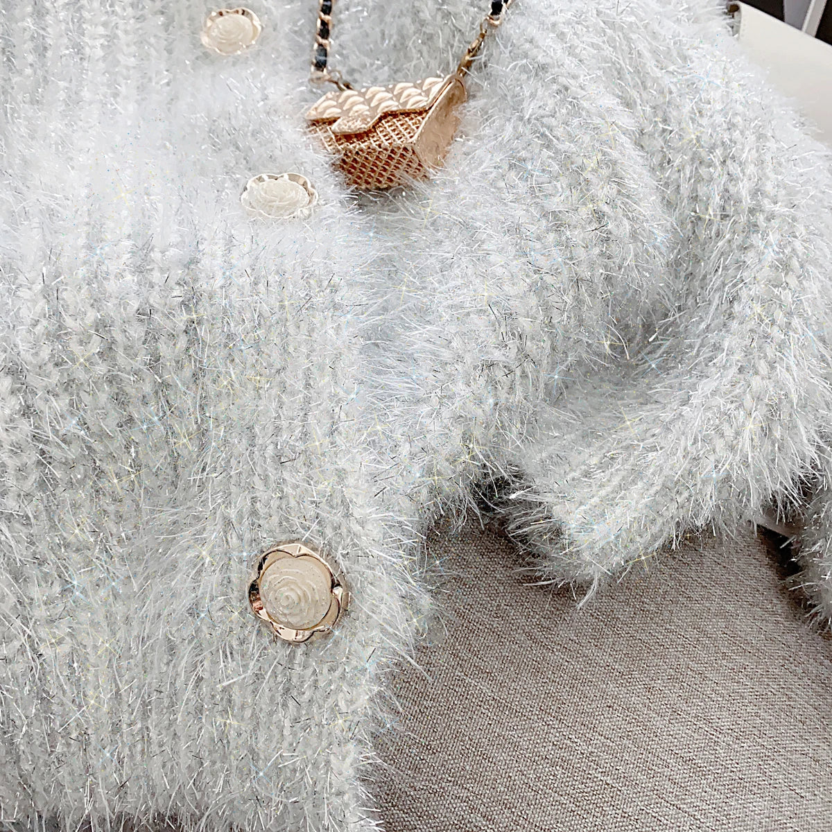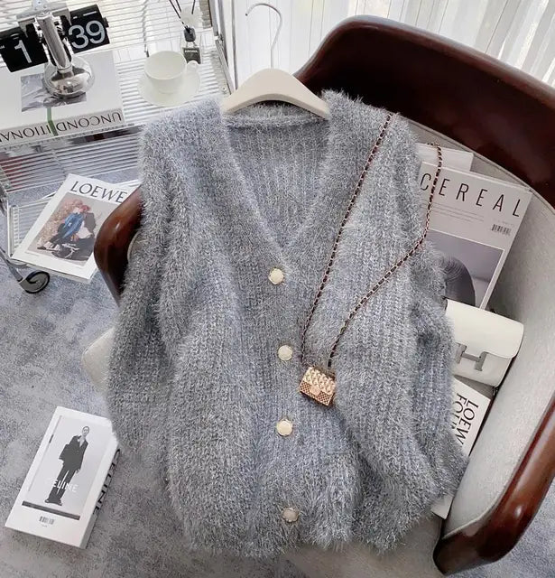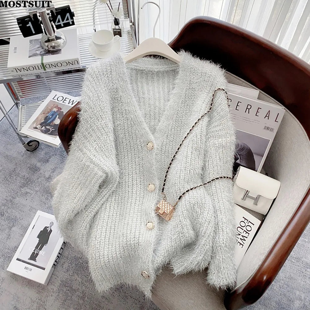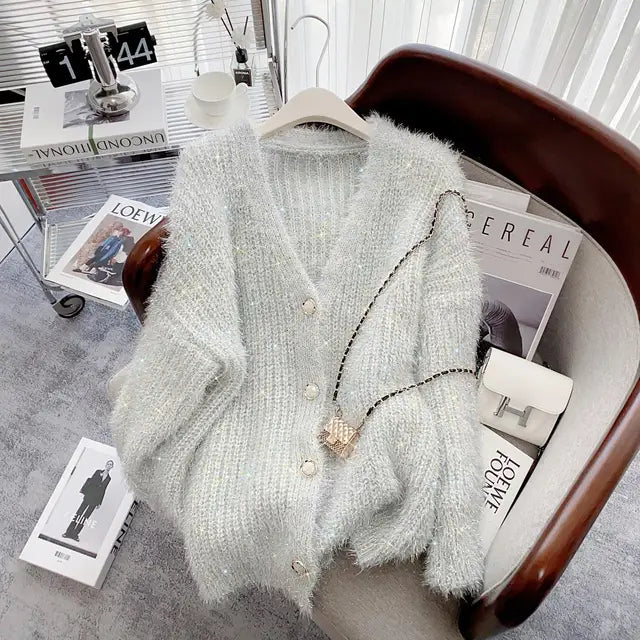 Silver Thread Knitted Sweater Coat Women V-neck Loose Fashion Chic Cardigan Jacket Long Sleeve Oversized Thicken Jumpers Tops