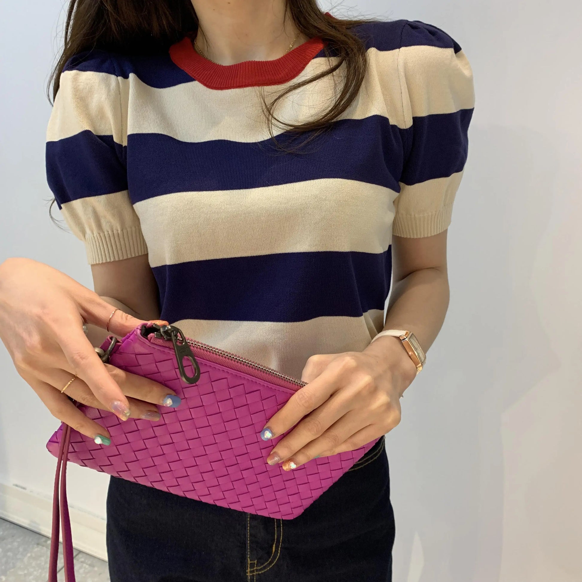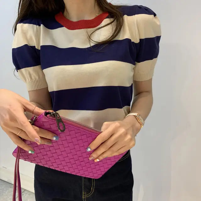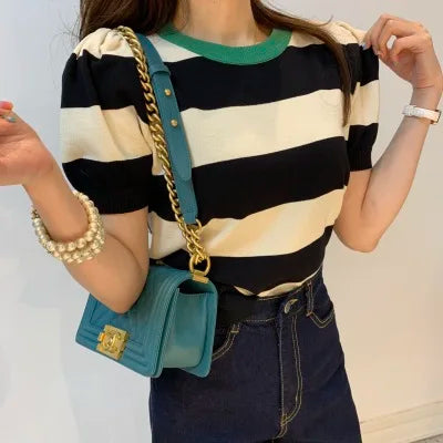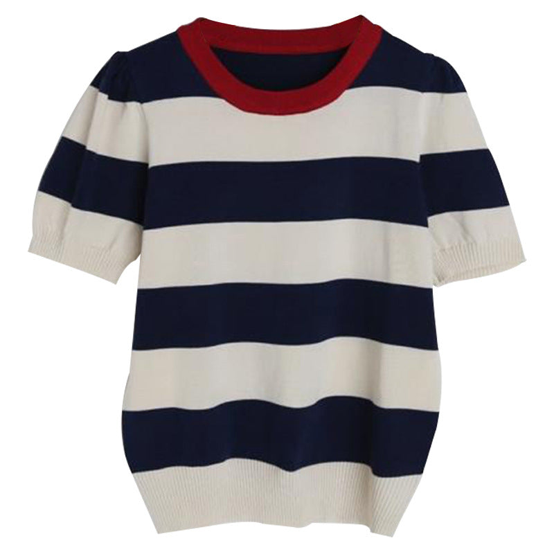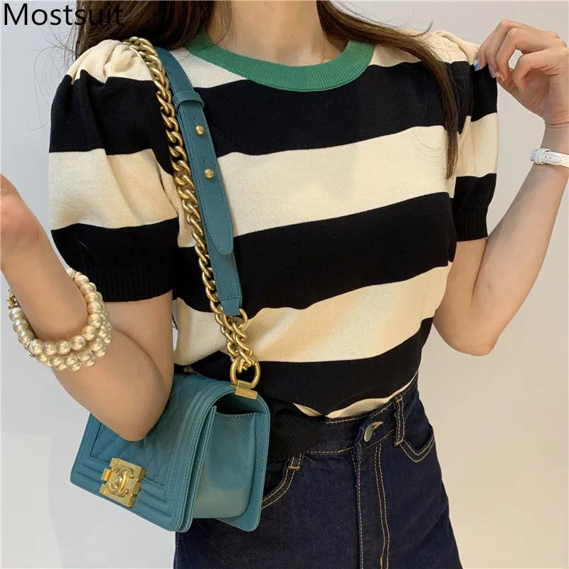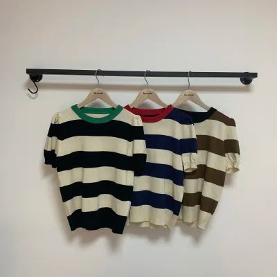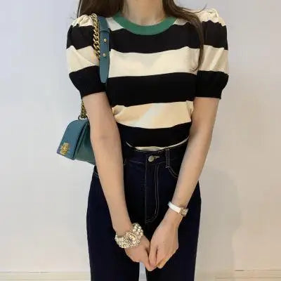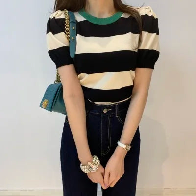 Summer Korean Knitted Striped T Shirts Tops Women Short Sleeve O-neck Casual Fashion Female Tees Pullovers T-shirts