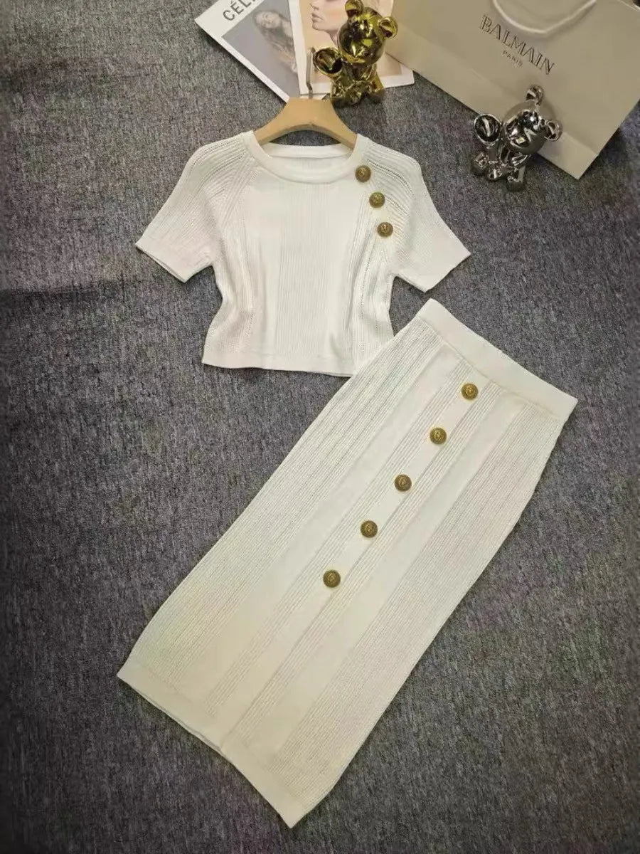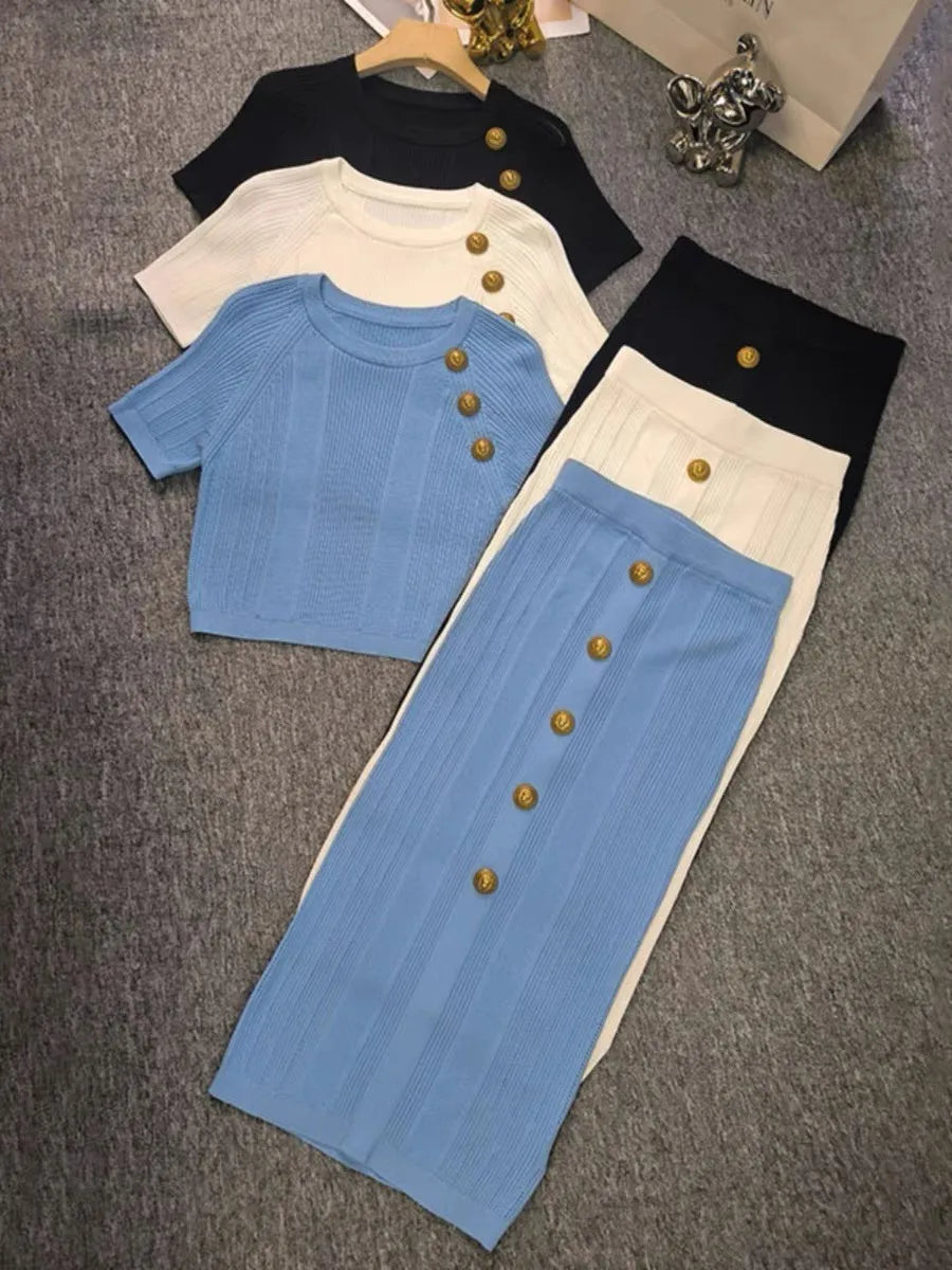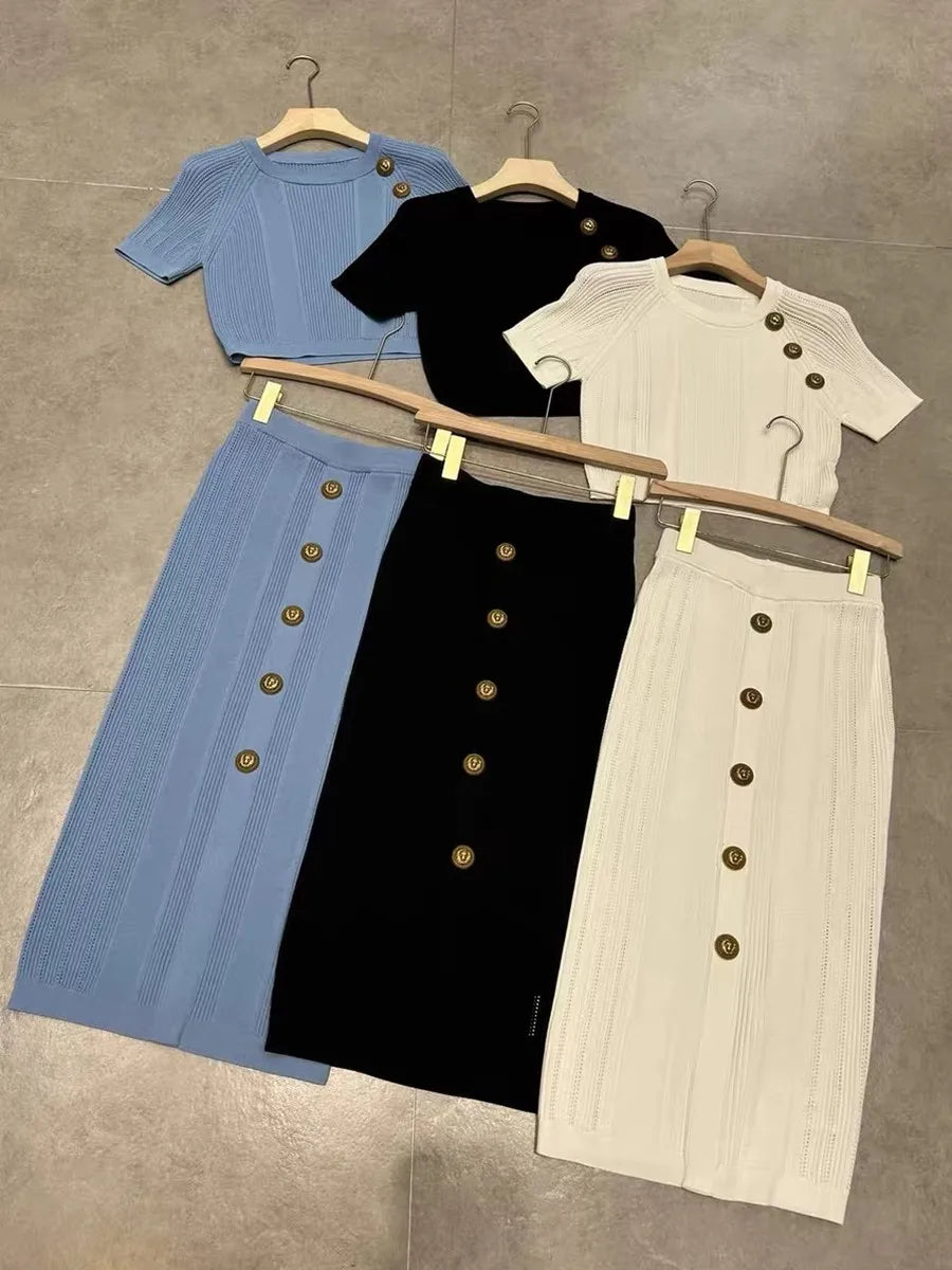 Vintage Slim Knit 2 Pcs Skirt Sets Women 2024 Summer Gold Buttons Short Sleeve Sweater + Pencil Long Skirt Outfits Matching Set