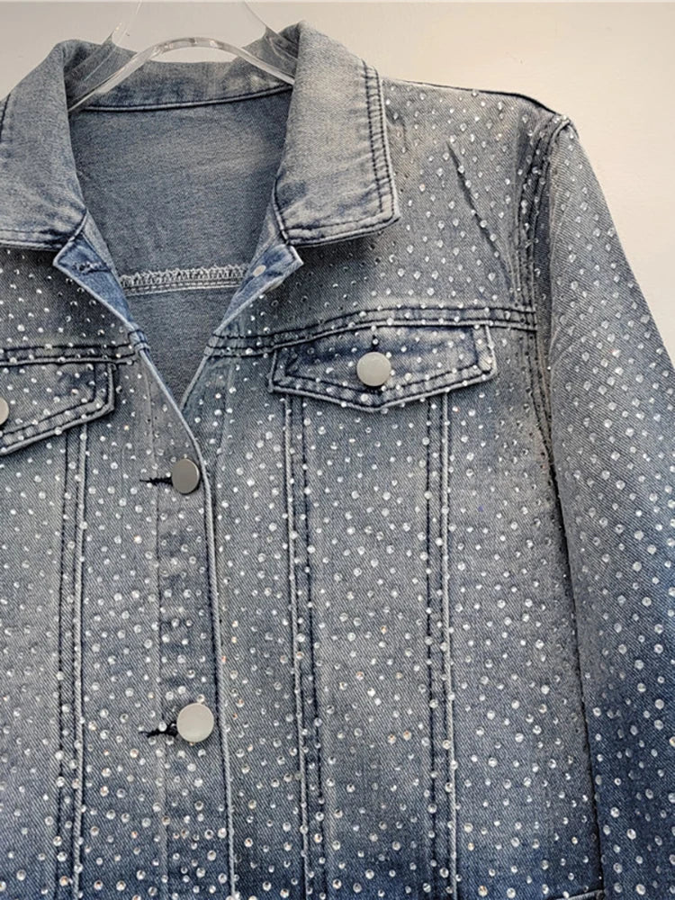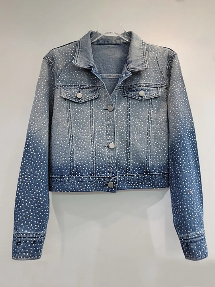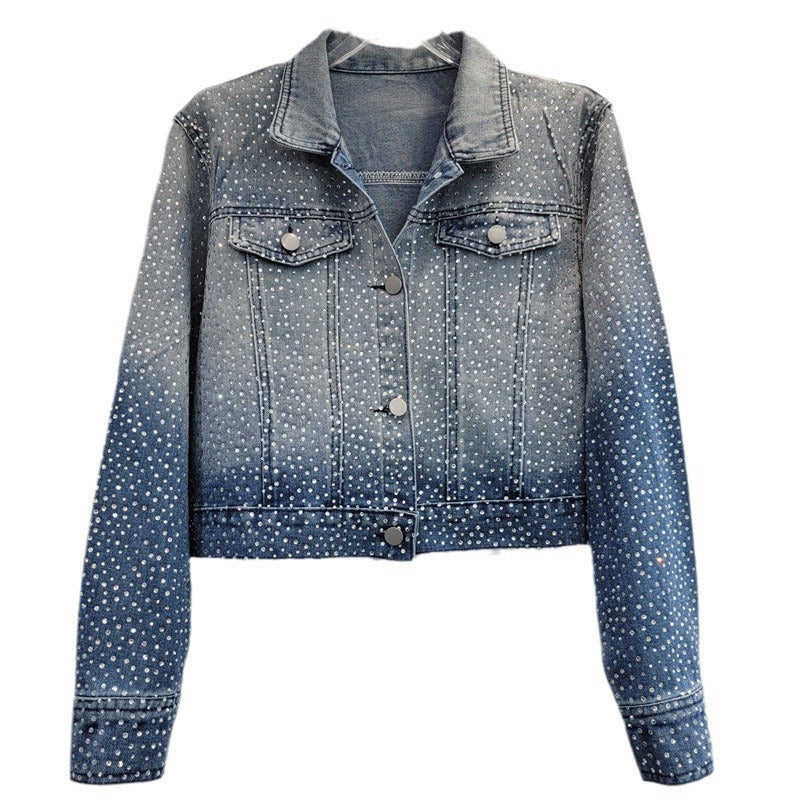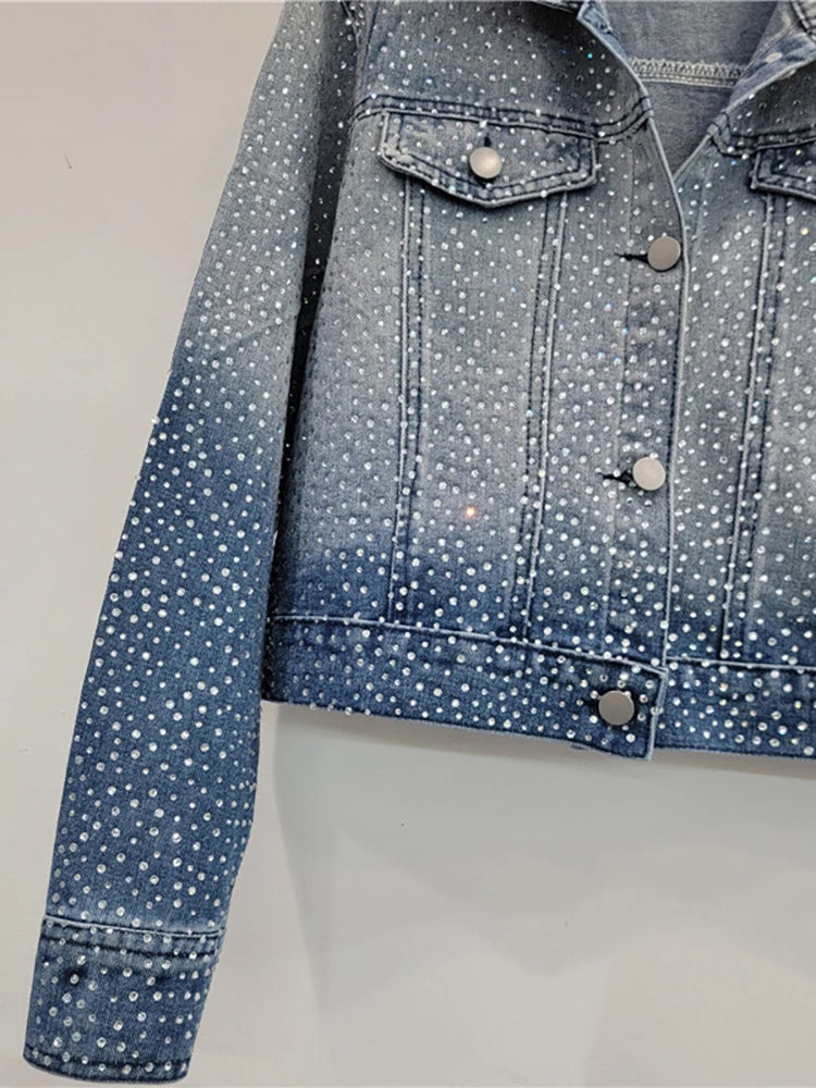 Women's Denim Coat Washed Gradient Blue Design Long Sleeve Full Diamonds Rhinestone Jackets Autumn New Fashion